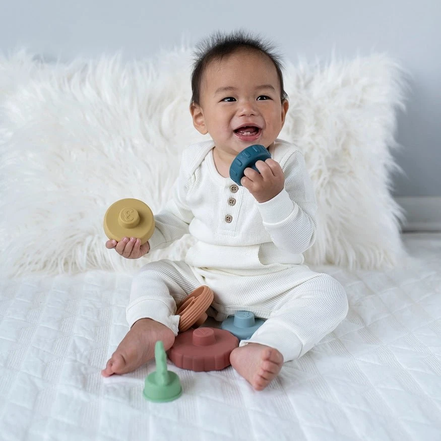 Stack and Soothe! Elevated to perfection, our Itzy Stacker™ silicone stacking and teething toy offers sensory exploration with multiple textures for baby to engage & enjoy!